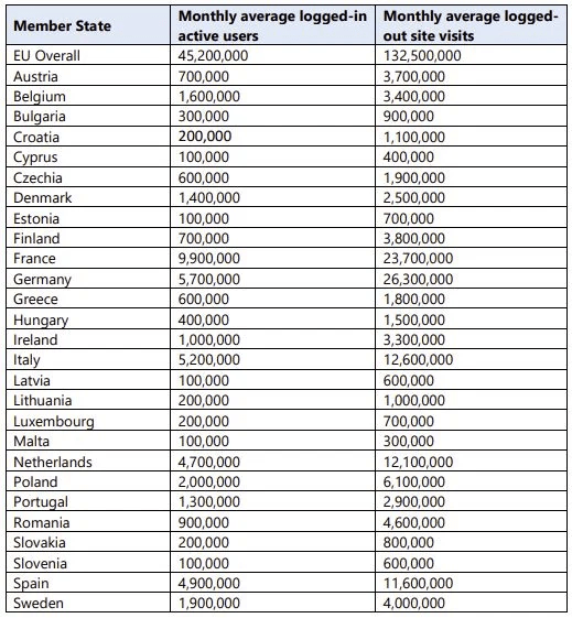 Conform EU The Digital Services Act (DSA)* marile platforme sociale online care operează în regiunea UE sunt obligate să raporteze cel puțin o dată la 6 luni numărul lunar de utilizatori activi.
